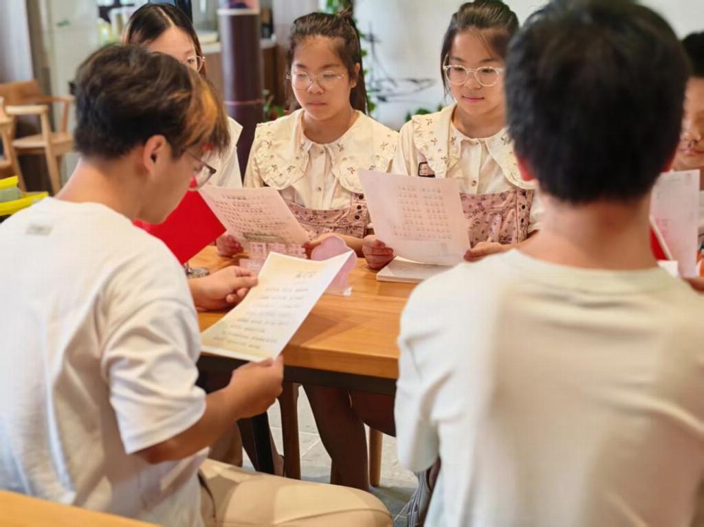 完成参观调研后,实践团来到常熟市,暑假里的孝爱书房人流量大、受众多元,成为开展沉浸式宣讲的绝佳阵地,实践团成员钱思佳率先开讲,声音沉稳而有力量,内容紧扣苏州本土的红色历史脉络。以五卅路的由来为起点,她结合实地走访的所见所感,生动还原了那段风雨如磐的岁月中进步青年们热血奔走的场景,把抽象的历史变成了可触可感的真实叙事。互动环节中,团队成员们以“谁在背后守护我们安心读书”设问,引发孩子们热烈讨论,现场氛围迅速活跃。孩子们既了解了祖国发展成就,更明晰“爱国”不是遥远口号,而是与个人生活紧密相关的责任与担当。一粒粒爱国的种子,正于无声处生根发芽。
